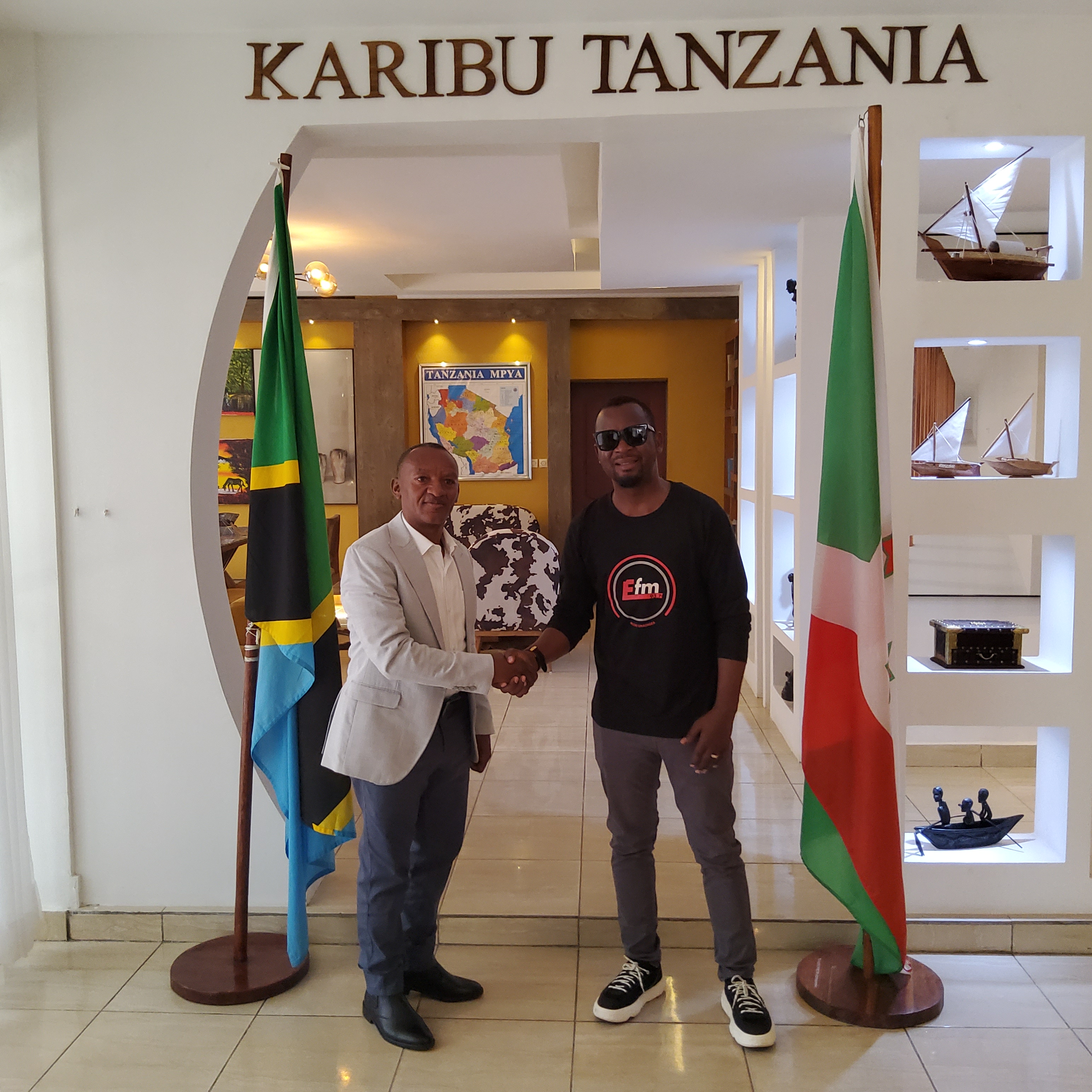 LEO TAREHE 27 JULAI, 2024 OFISI YA UBALOZI WA TANZANIA NCHINI BURUNDI UMETEMBELEWA NA MKURUGENZI MTENDAJI WA EFM RADIO NA TVE, BW. FRANCIS CIZA(MAJIZZO) AKIWA AMEAMBATANA NA BW. GEOFFREY NDAWULA, MKURUGENZI MZALISHAJI EFM RADIO NA TV NA KUFANYA MAZUNGUMZO MAFUPI NA MAAFISA WA UBALOZI. BW. MAJIZZO YUPO NCHINI BURUNDI KWA AJILI YA KUTAFUTA FURSA YA KUWEKEZA NCHINI BURUNDI KWENYE UPANDE WA RADIO NA TV.