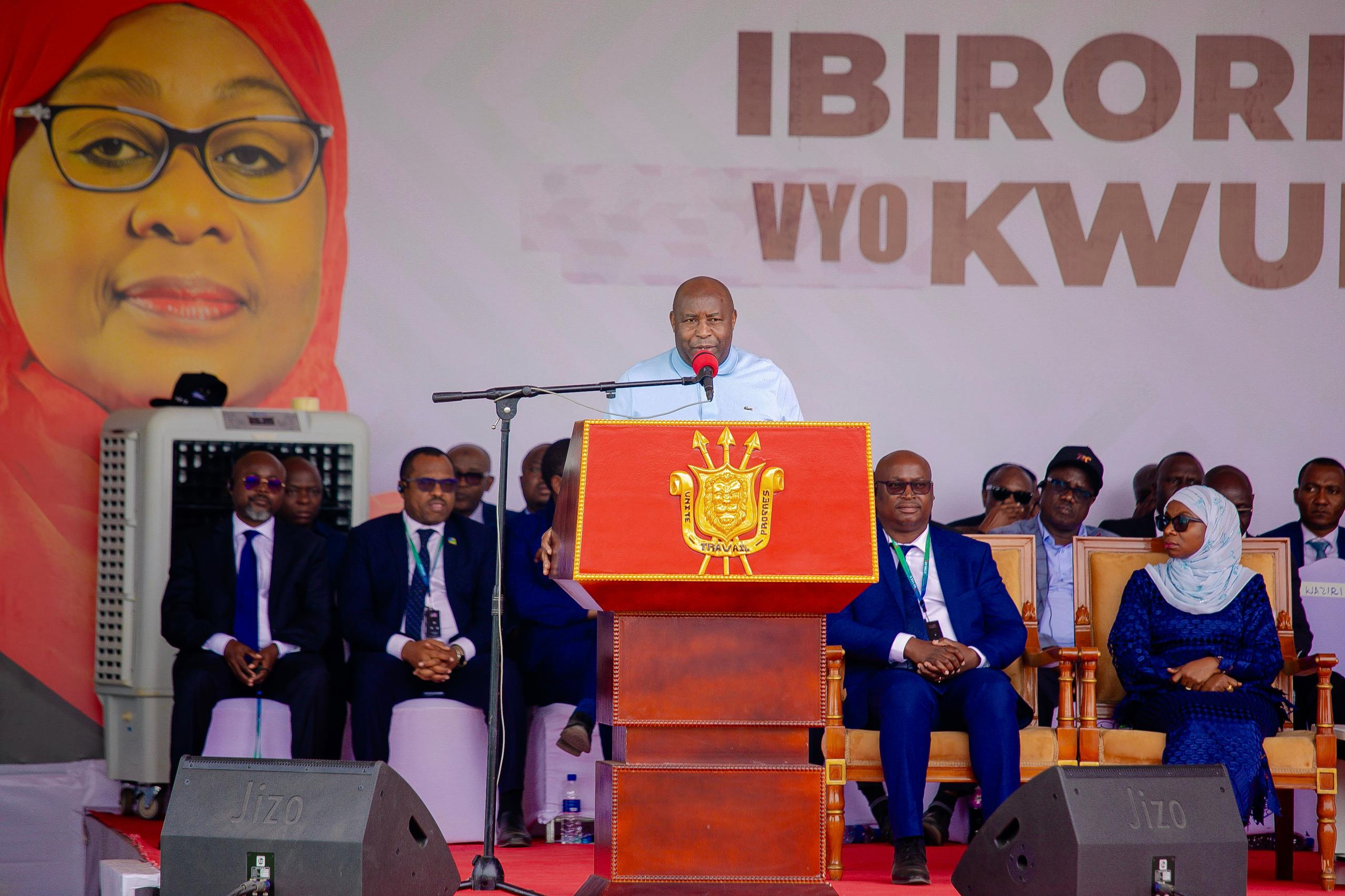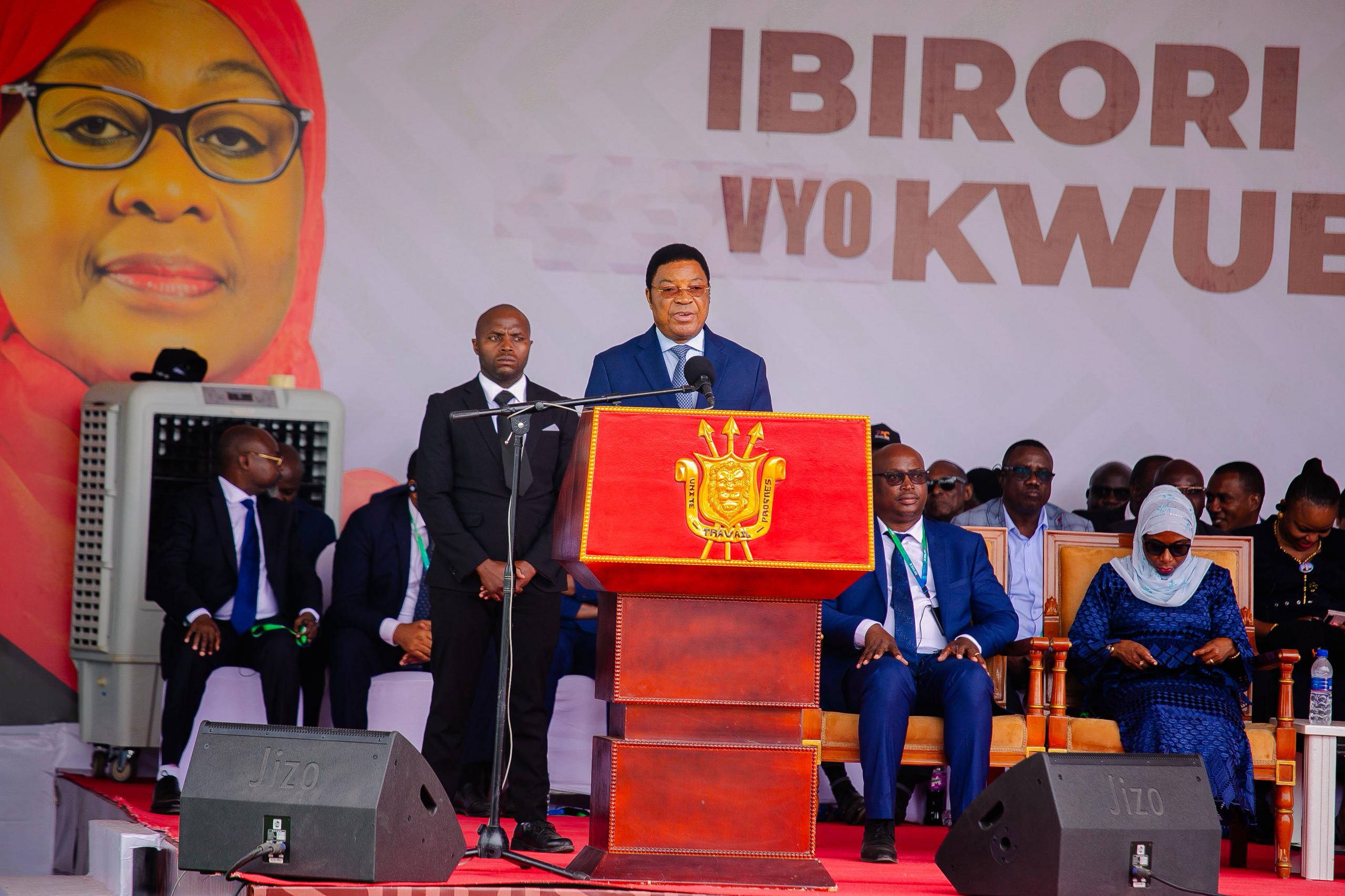 MHE. EVARISTE NDAYISHIMIYE, RAIS WA BURUNDI AKIHUTUBIA WAKATI WA HAFLA YA UWEKAJI WA JIWE LA MSINGI.